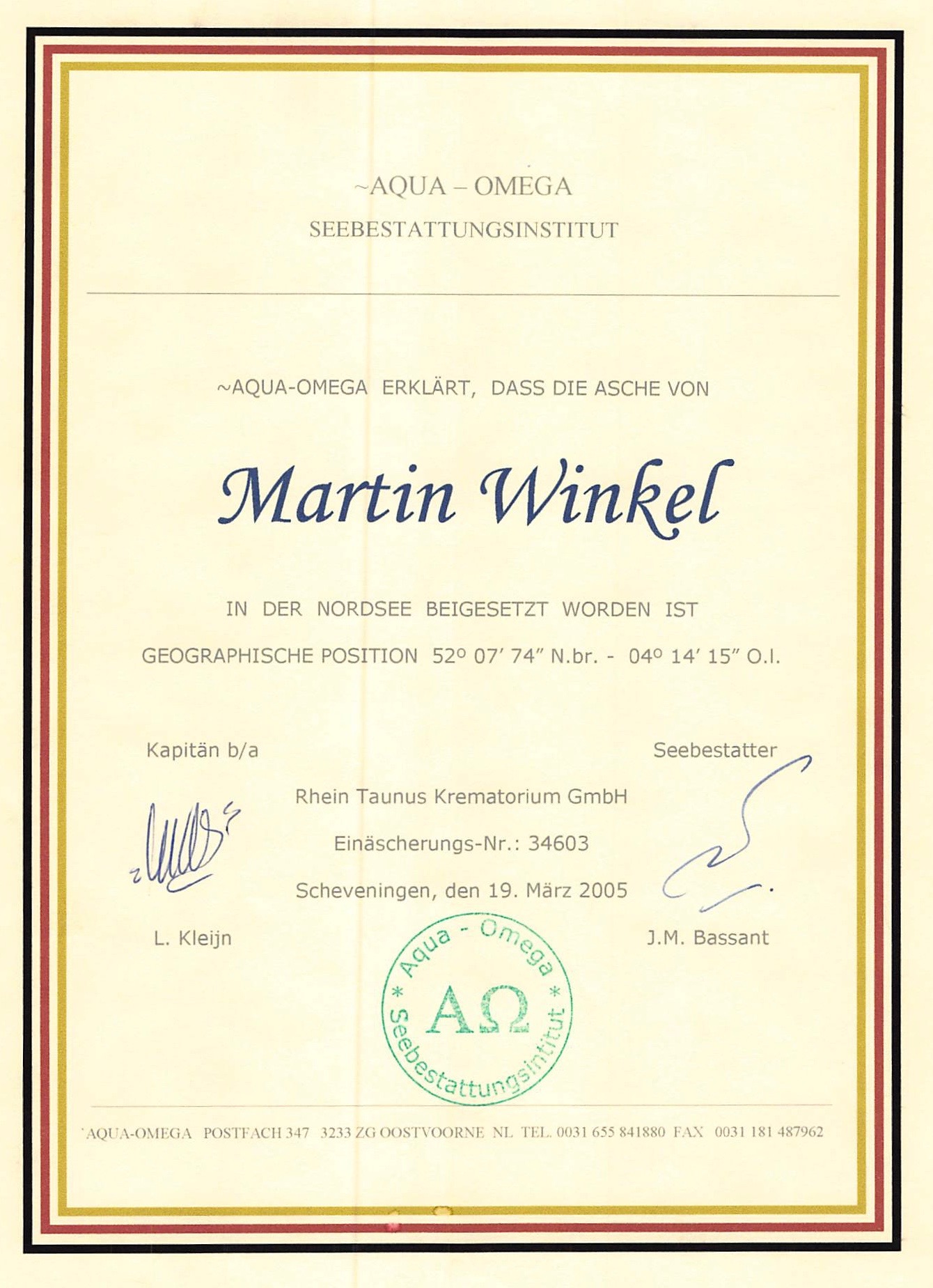 Am 19. März 2005 fand die Seebestattung in den Niederlanden statt: