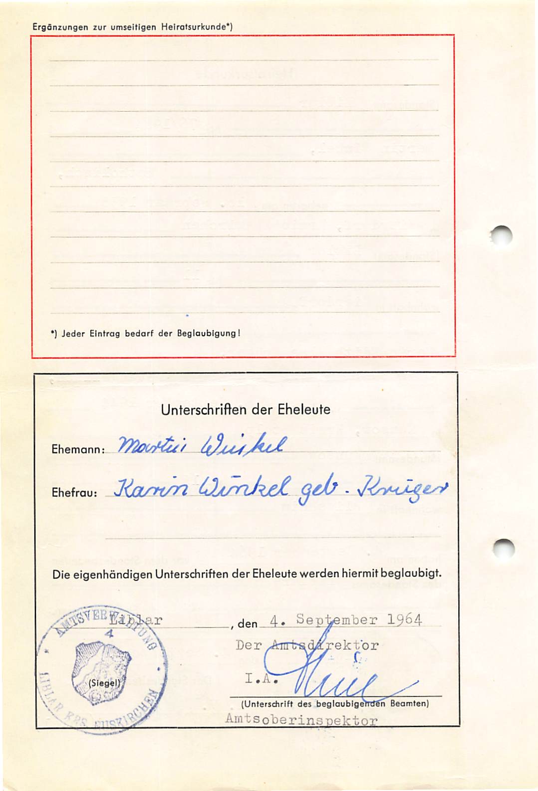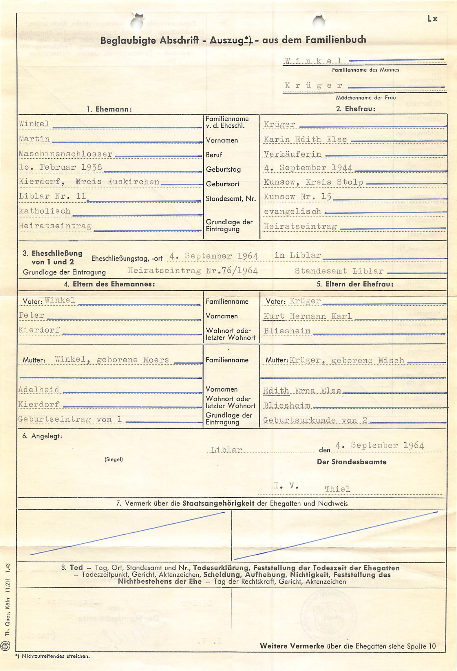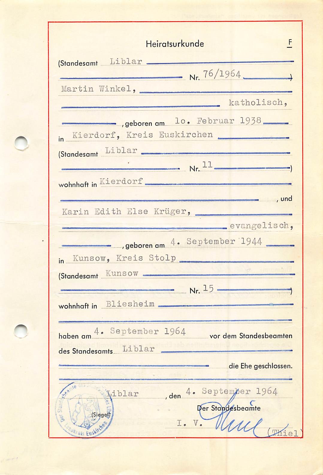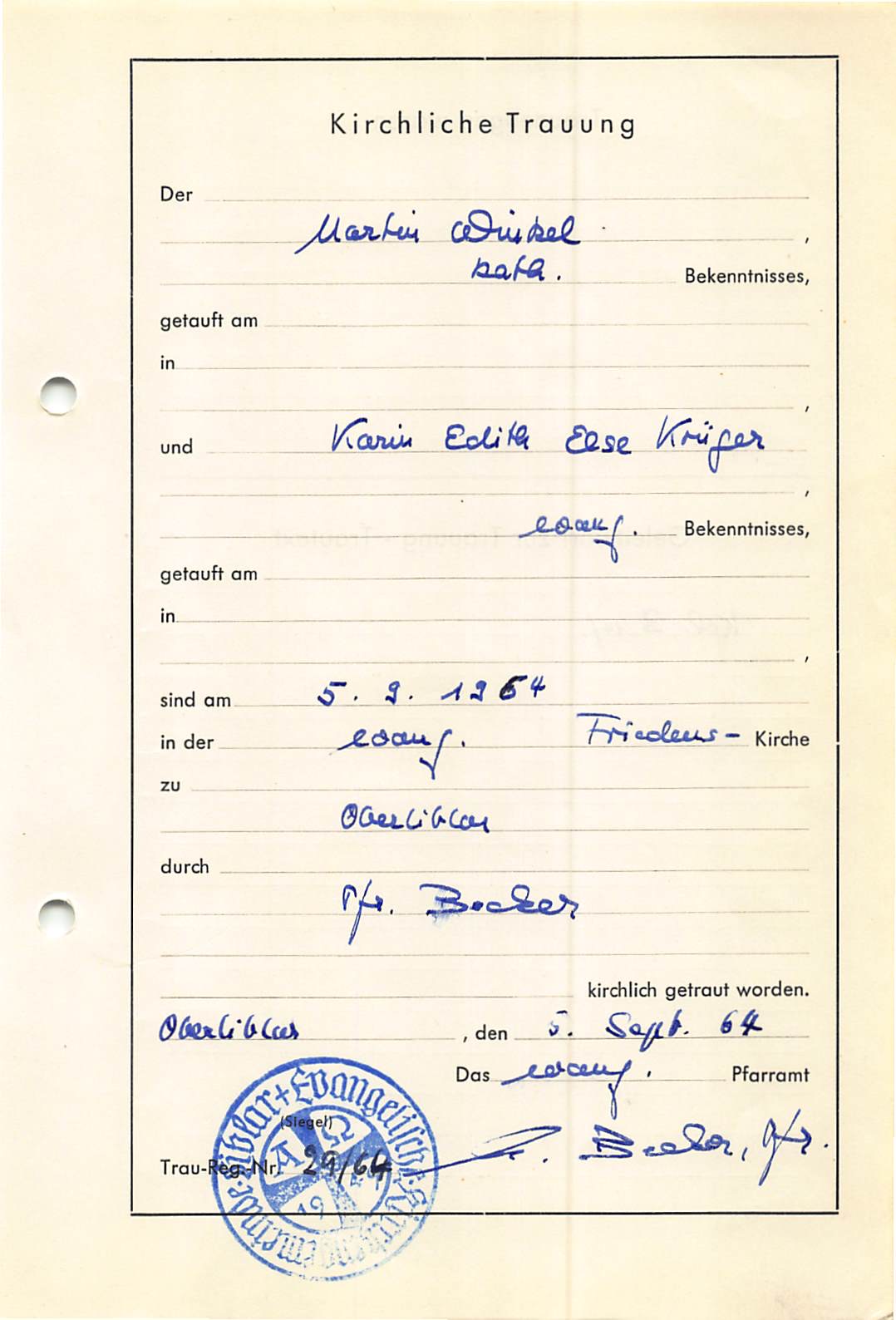 Birgits Eltern haben am 4. September 1964 standesamtlich geheiratet: